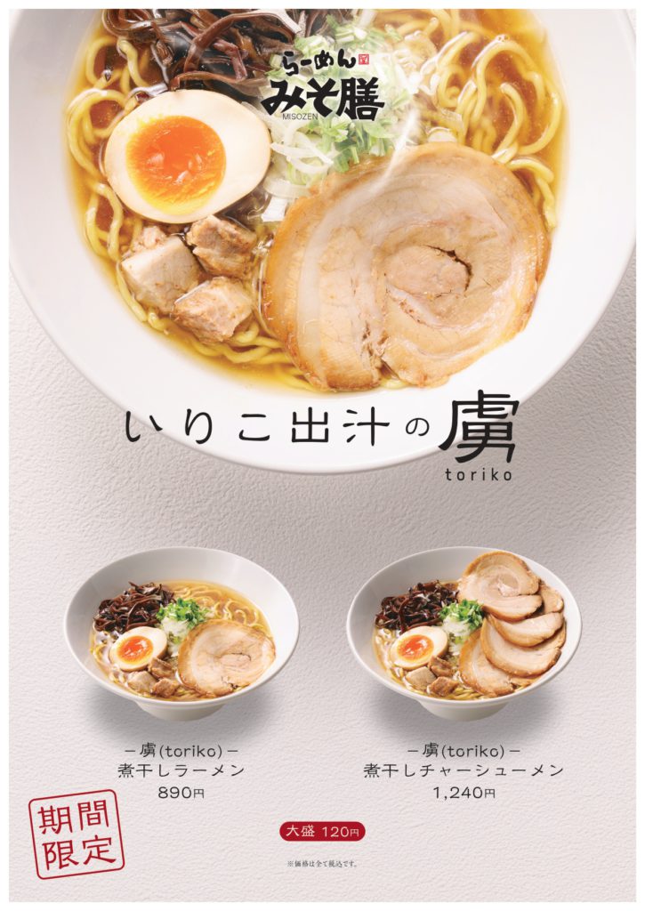らーめんみそ膳丸の内店にて期間限定「虜(toriko)煮干しラーメン」シリーズが2026/4/1(水)より販売中です!